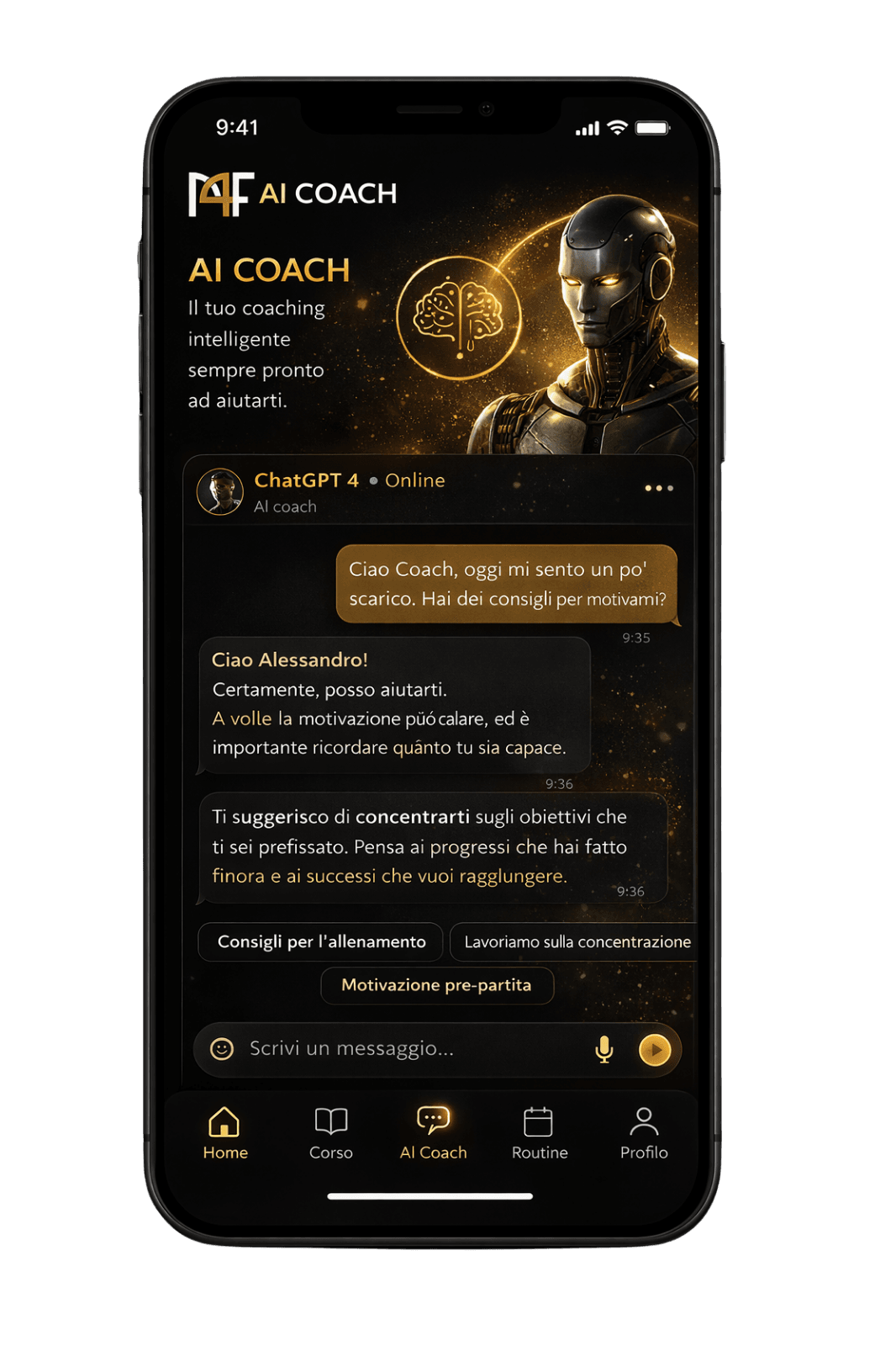 - AI Coach: esercizio + frase guida + micro-obiettivo